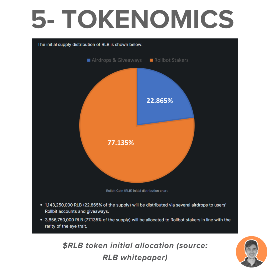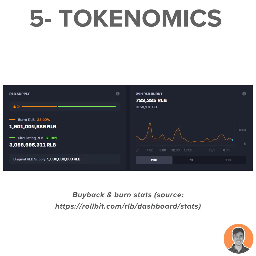 Rollbit utilizes a portion of its daily revenue from its Casino, Crypto Futures, and Sportsbook verticals to purchase and burn $RLB tokens.