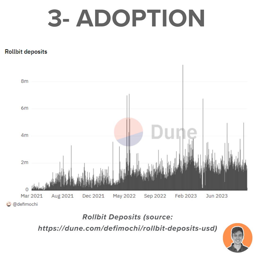 Additionally, the Rollbit user deposits show a promising upwards growth trend (Dune Dashboard created by
