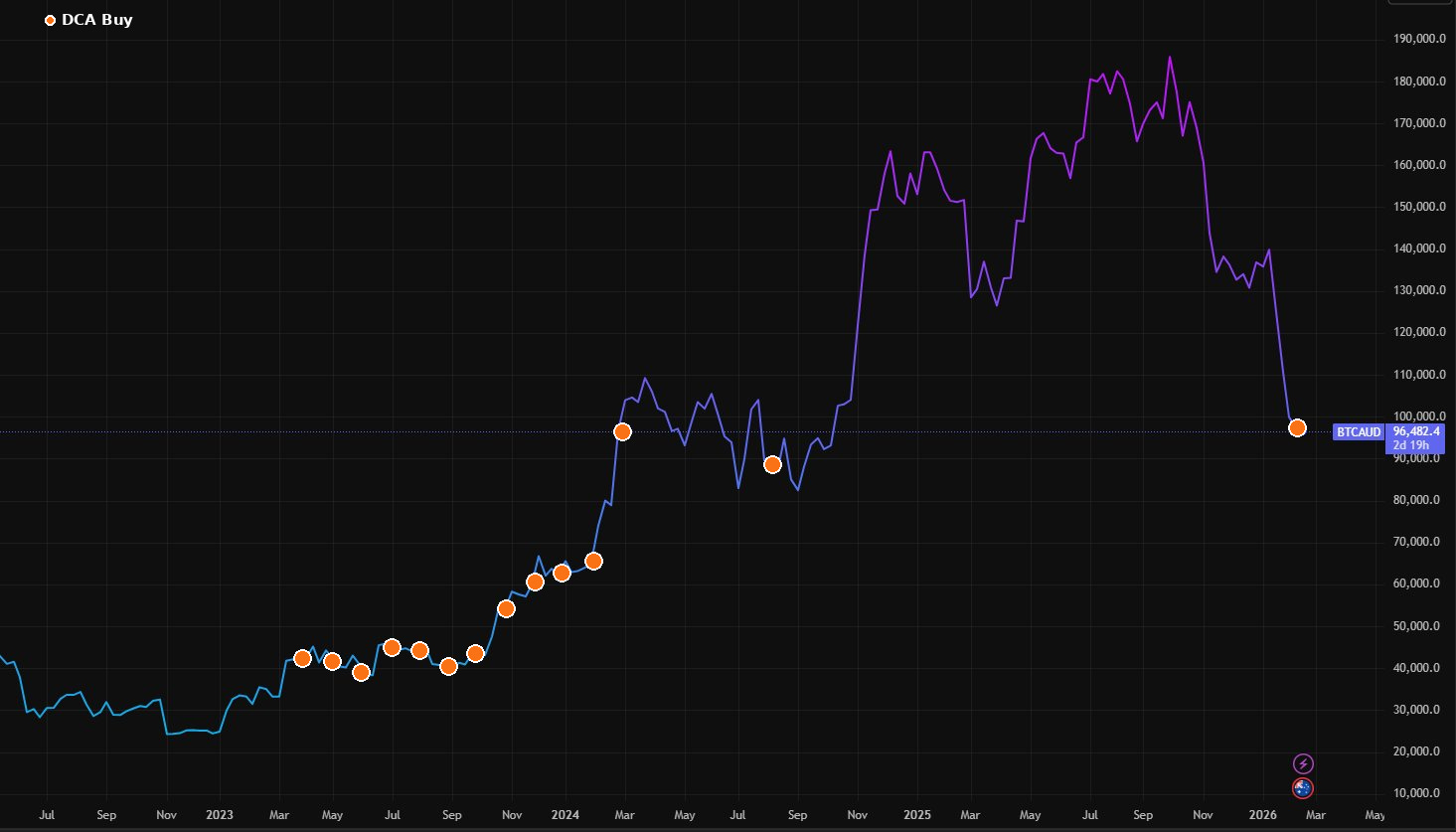 It’s the BTC I started DCA-ing into my SMSF (think self-directed 401K) back in early 2023. I set up a recurring monthly buy order. Set and forget.