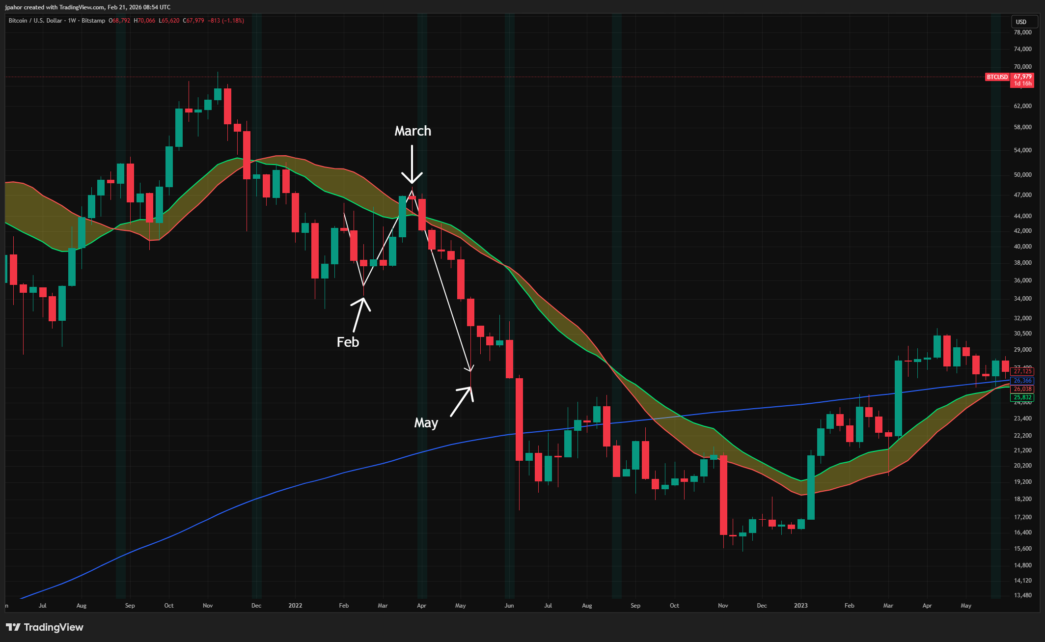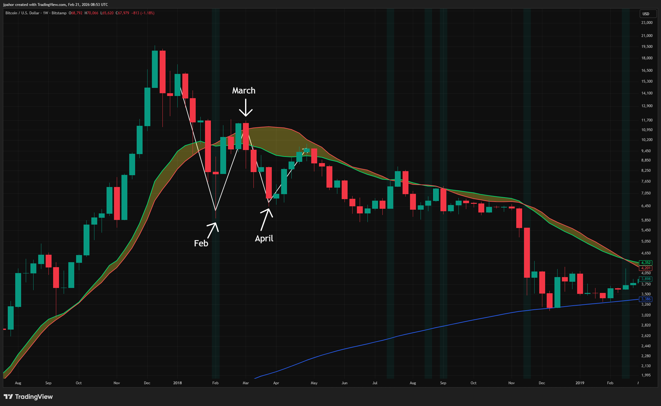 If history rhymes, we consolidate here, rally into March forming a lower high, then dump again into April/May. This same structure played out in 2014, 2018, and (with slight variation) 2022.